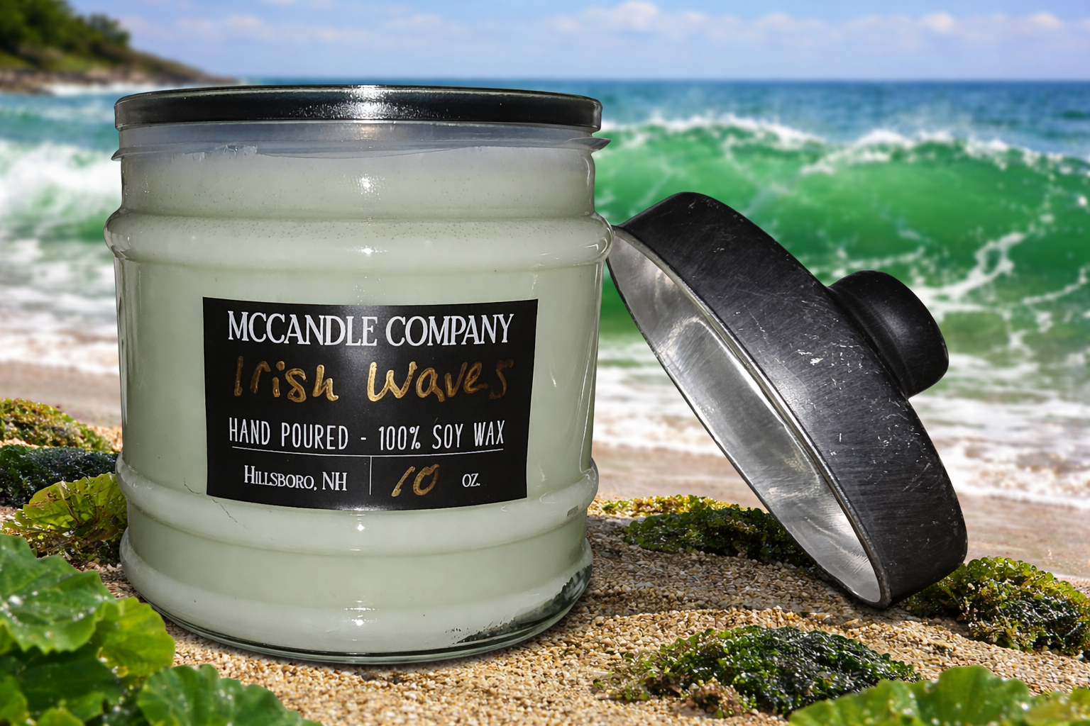 10 oz glass barrel jar with tin cover. 100% Soy Wax, ‘irish waves’ scent. Small batch, only 3 made. Smells very fresh and clean. Burns nice and lengthy.