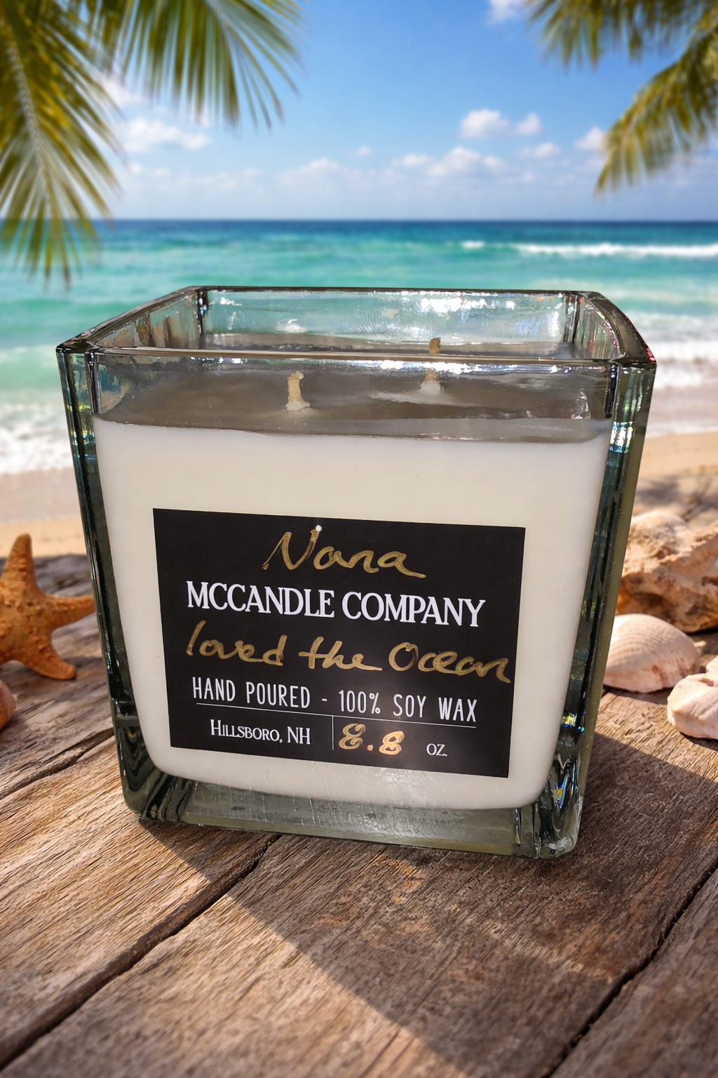 8.8oz square double-wicked glass candle with the scent of coconut and limes. My Nana loved the ocean and all of her candles in her home smelt of coconut and this scent reminds me of her. Made in a small batch of 4 candles made of 100% soy wax.